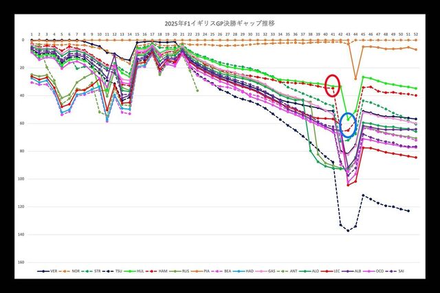 F1イギリスGPの決勝レース中のギャップグラフを見ると、ヒュルケンベルグとハミルトンの差が拡大しているのが分かる。この差がついたのは、ピットアウトした周のラップタイムにあった。